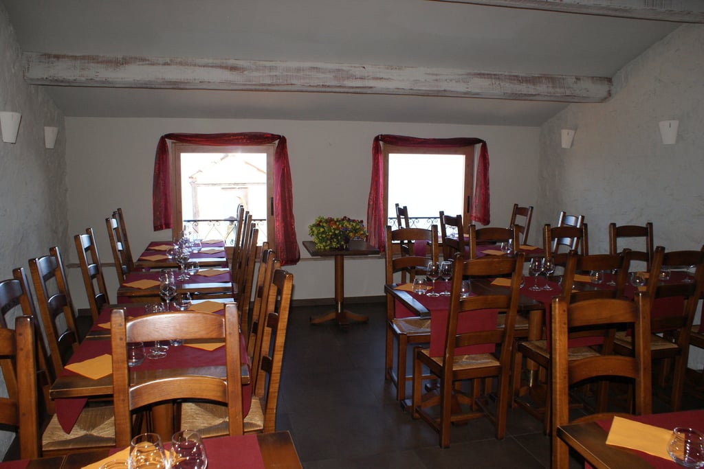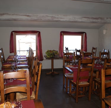 Immergetevi nell'atmosfera calda e accogliente della nostra sala da pranzo, dove la tradizione incontra il comfort. Tavoli in legno massiccio, apparecchiati con cura e circondati da sedie artigianali, vi invitano a prendere posto per un banchetto memorabile. Le pareti in pietra a vista, illuminate da luci soffuse, creano un ambiente intimo, mentre le finestre drappeggiate di velluto rosso lasciano intravedere scorci pittoreschi del villaggio di Eze. È una vera promessa di un'esperienza culinaria autentica e confortante.