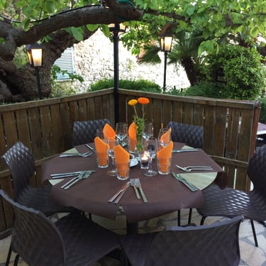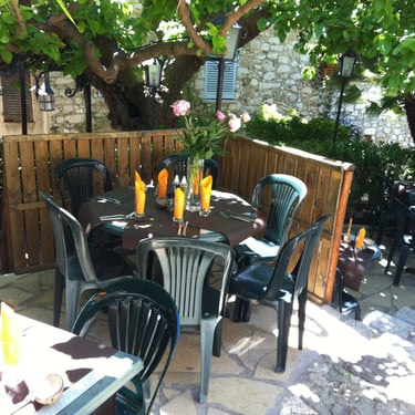 Immaginatevi sulla nostra pittoresca terrazza, dove il fascino della pietra antica e il sussurro delle foglie nella brezza mediterranea creano un rifugio tranquillo. Circondata dal verde e dai fiori colorati, con le persiane blu che si aprono sull'autenticità di Eze, la nostra terrazza è un'oasi di serenità. Qui ogni pasto diventa un momento privilegiato, sotto lo sguardo benevolo della nostra insegna, Le Nid d'Aigle, che promette un'esperienza culinaria tanto memorabile quanto incantevole.